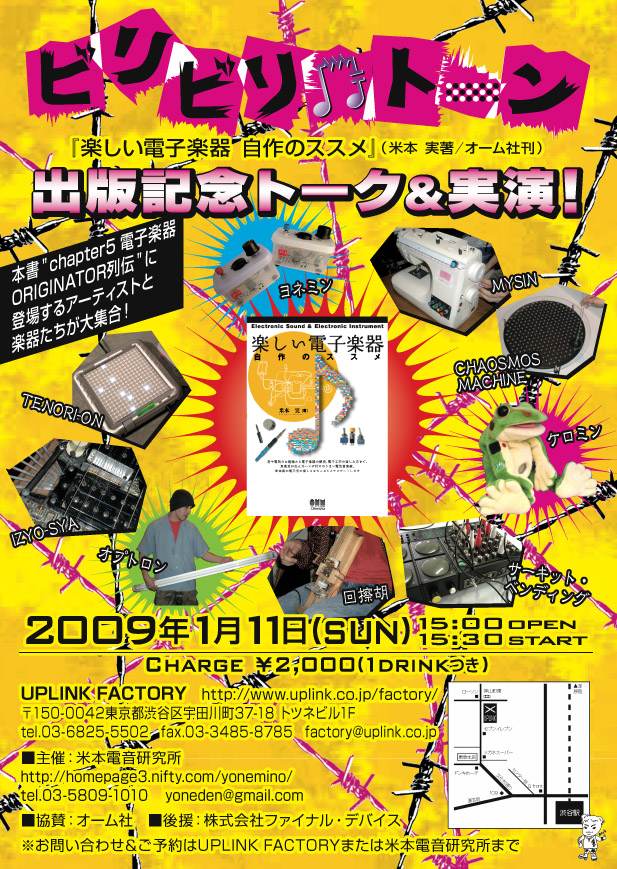 『楽しい電子楽器 自作のススメ』の出版を記念して、著作の中でとりあげられたアーティストが集結し、オリジナル楽器のデモ演奏や開発秘話、音楽の未来について語り合うイベントを行いました。書籍の販売はもちろん、米本 実のオリジナル電子楽器「ヨネミン」、米本電音研究所ロゴのオリジナル缶バッジ、米本参加のレアなCDなども販売しました。