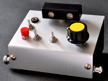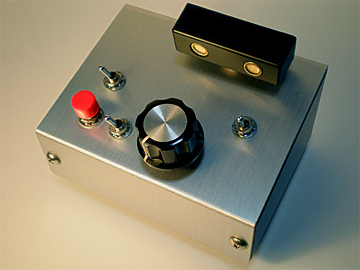 Y-LINK対応機器ボタンを押すと音が鳴り、ボリュームを回すと音高が 変化するシンプルな発振器。 トランジスタ2個、コンデンサ1個、ボリューム1個という シンプルな回路だけで出来ています。 一番最初に作った電子楽器で、たくさんの改良を重ねて、 現在のタイプに落ち着きました。 レトロなロボットの顔のような光センサーを取り外し、 いろいろなオプションを交換することが出来ます。 その端子は、2009年に異常奏者さんによってY-LINKと名付けられました。 |