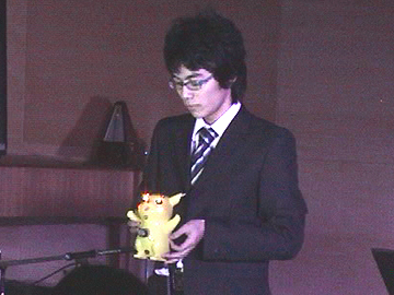 大学の文化祭で、ピカルミンを演奏する大久保さん。会場は爆笑の渦に。 |