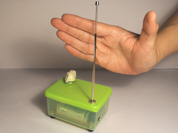 実はこのテルミン、単三電池1本で動作させているせいか反応する距離がとても短くて、