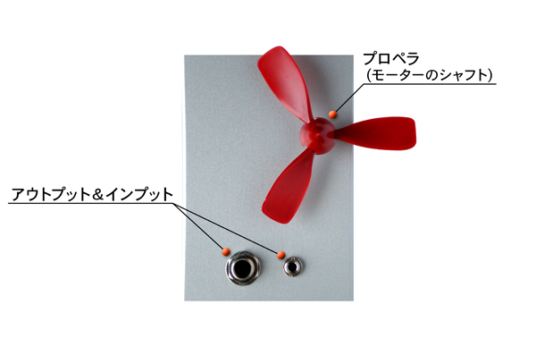 米本: モーターの軸を回して生じる電気を音として聞くユニットなわけよ。モーター・オシレーターの頭文字をとってMOちゃん。これまた地球に優しい自家発電系!!