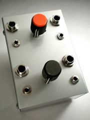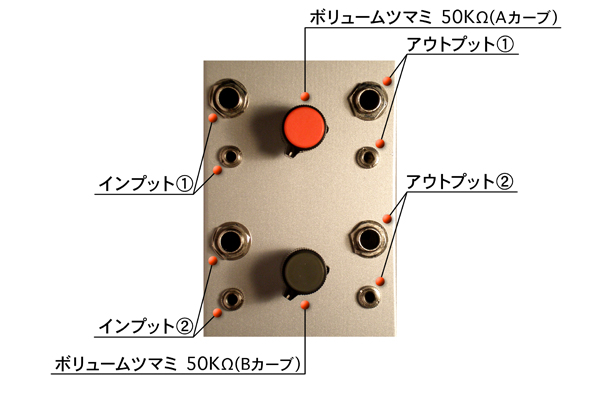 私の本「楽しい電子楽器 自作のススメ」のP184で、作り方を紹介しています。 米本: 音量を下げるためのユニット。レベルや電圧の大きいユニットと、デリケートなユニットの間に入って、パワーを調節するナイス・ガイ!独立2系統。 助手: いわゆるボリューム、つまり可変抵抗が中に入っているんですね? 米本: そうそう! 助手: ツマミの色が上下で違いますけど…。 米本: いい質問だね! 減衰くんは50KΩの可変抵抗を使用してるんだけど、上はAカーブ、下はBカーブとなっていて、目的に合わせて選べるようになってるの。 助手: Aカーブ、Bカーブって? 米本: 簡単に言うと、回すときの抵抗値の変化の仕方が違うのよ。Aカーブは対数的に、Bカーブは直線的に変化しているの。 助手: なるほど…って、ちょっと難しいかな(汗) 米本: Aカーブは音量調整用に、Bカーブ電圧・電力調整に、主に使われているみたいですよ。減衰くんは1つ作っておくと、いろいろと使えて便利よっ! |