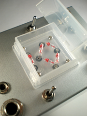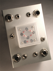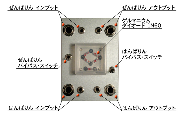 米本: エレキギターや音楽を入力すると、音が歪みます。多くのギターリストの方々から、ゴージャスな歪みじゃないけど、素朴なファズのようで、演奏の強弱による歪みのレスポンスが、とてもアナログ的で、ブルースの演奏などに適しているとの感想を頂いてますね。 助手: 相変わらずエコですね(笑)。 米本: シンプル・イズ・ベスト!!(笑)上側の入出力がぜんぱりん、下側がはんぱりん。それぞれトグルスイッチでバイパスすることができるよ。 |