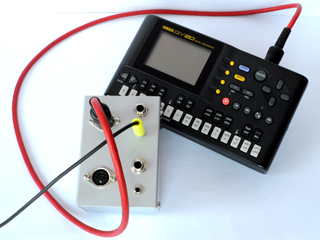 米本: 一応、使い方を説明するとね、上の写真のようにMIDI機器のMIDI OUTからMIDI男につなげで、MIDI男からスピーカーにつなげると、ブチブチブチ…とMIDIの通信信号を聞くことが出来ます。そう言えば、Y社のエライ人はテ○○オンとつなげてブチブチ音を楽しんでいたなぁ。 助手: 便利じゃありませんよ!高価な電子楽器を壊してしまったらどうするんですか? 米本: こういう危険と隣り合わせってのが、本当の意味での現代音楽だと思うんだよね。もっときちんと評価されても良いと思っているんだけど(笑)。 助手: どこが現代音楽ですか!(笑) 米本: いやいや、コンセプトとしては面白いと思うよ。MIDIを受けるところに違う通信信号を入れて機器の動作を見守るってのは。英語を日本語で強引に解釈させるような感じかな(笑)。コンピューター上のシミュレーションだけでなく、実際に物理的に事故が起きるかも?ってところが、現代的だと思うよ(笑)。現実問題、一寸先は闇のご時世だしね。予想外の結果になったり自分で完全に制御出来ないってところに、ナウな感じがするんだよね。