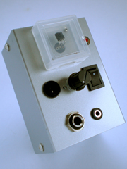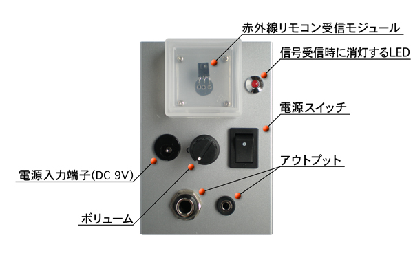 リモコンなどの赤外線を音として強引に聞く装置。身の回りにあるリモコンで気軽にセッションが楽しめます。 リモコンを受光部に向けてボタンを押すと、電子音がします。
