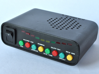 米本: 8種類の効果音が鳴らせるユニットです。以前秋葉原の秋月電子で売っていた同名のキットを師匠の山内さんからいただいて、それを組み込んでます。で、改造したファミコンⅠコンをつなげて音を出します。ちょうどボタンが同じ8つあるからね。 助手: なるほど。 米本: ボリュームでピッチ(再生速度)も変えられるから、結構いろいろな音が出せるよ! 米本: ↑以前はこんな感じでケースに組み込んでライブ等で使っていたのだけど、今回、SYSTEM Y規格のケースに詰め直したんだ。 米本: ↑自作楽器博物館の地下3階に展示してあるコントローラーは全てつなげられるんだ。また旧セガ仕様のコントローラーなら問題無くつなげられるし、少々ボタンの位置が入れ替わっちゃうけどATARI仕様もいけるよ! 助手: 相変わらず互換性を考えてますね(笑)。 米本: そもそもバトルサウンドとの出会いは、1987年頃、新小岩のおもちゃ屋さんの店頭でね、ひと目惚れして買ったんだ。