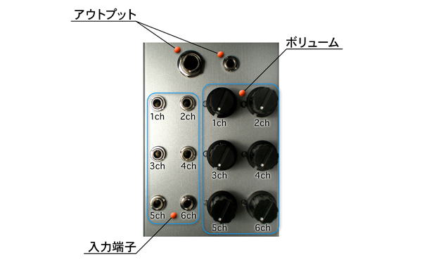 6つの音声や電気信号を混ぜ合わせるユニット。