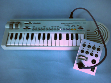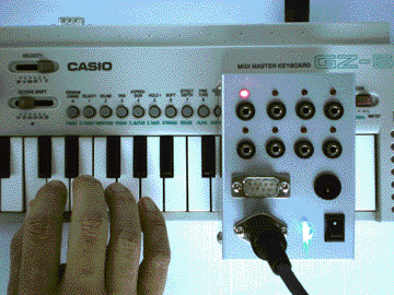 米本: そう、シリアルポートからの信号をパラレル送信したくてね。そうすればパソコンから自作楽器をコントロール出来るじゃない?もちろんMIDIで制御できれば理想だったけど、MIDIインターフェースなんて作れないと思ってたし。2002年ごろ、まずはトランジスタ技術に載っていた通信の工作記事を元に、ボード部分を私が工作して、comポートから制御するJAVAアプレットを二見さんが改良して。かなり良いところまで完成していて、自作楽器を自動演奏できてとても楽しかった。 二見: いやー、マイコン始めて6ヶ月くらいしか経っていないモンに、出来るわけないと思ったし。 さらにねえ、いきなりMIDI INをやらせる人もいないよね。最初は比較的簡単なMIDI OUTから始めると思うんだけど…。 米本: INもOUTも同じようなもんだと認識しているあたり、当時の私の無知ぶりを証明してますな。ごめんごめん、ぎゃはははは(笑)。 二見: さて、ちょーMMでも話が出ていますが、子供の頃に出会ったカシオのキーボードに付いていた見知らぬコネクタが実はMIDIとの出会いだったのです。学校の皆に聞いても知らぬ存ぜぬのオンパレードで、独学、といっても、書籍を買って読むくらいで意味を理解しようと頑張っていました。だけど、おいどんの極度にワルい頭では理解できず、今に至ったワケなのであります。いやーあ、こういうのが作りたかったのよ、ほんとに。 米本: そうだよねぇ、MIDI関係の自作って敷居が高いよね…。 二見: なので、今回はマジメに取り組みました。っつーヵ、中学校からこのようにマジメに色々やっていれば、今頃は世界征服もメじゃなかったんでしょうなあ。