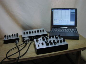 二見: うわあああ!10年くらい前に作ったパラレル送信機!(中央のユニットがインターフェース、パソコンの画面は改良したJAVAアプレット) 確か、JAVAアプレットで初めてアプリケーションを作ったんだったなあ。このアプレットも3000行を越す大作!良くやったなあ。全くJAVAとか知らなかったけど。
