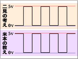 二見: ソレを聞いたおいどんは、頭の中が爆発しました。データの送受信の方式が逆転しているとは全く知らず、ちょーMMで出てきた概念が覆されました。データが出ているときだけ電圧が出ているものと、かれこれ20年以上勘違いしていたワケです。