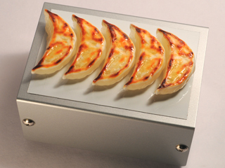 助手: ギョウザぁ~っ!! 米本: そうなの(笑)。食品サンプルに関心があった頃、宇都宮に行ったときお土産売り場で見つけてね、このギョウザ・マグネットたち。これをユニットにつけたら面白いかなと。5つも買ったから結構予算的に大変でレジに持っていくまでかなり真剣に悩んだよ、それだけの笑いがとれるか?って(笑)。で、なんと89番目のユニットは「ぎょうざ」という名前でMake: Tokyo Meeting 07に出展したんだ。 助手: もう何がなんだかわからない状態ですね…。 米本: まぁ、いろいろな可能性を模索していてね(笑)。その後、2012年の3月にKaseoさんが遊びに来たときに工作仲間が集まって盛り上がったんだけど、Kaseoさんが先に帰った後、ギョウザはいかがなものか?と異常奏者さんに指摘されたんだ。で、そこにいた仲間全員で、このユニットをどうするべきか!?真剣に討論したんだ。 ちょうど今、偶然にも異常奏者さんがいるからそのときのことを聞いてみよう! 異常奏者: ちょっと待って下さい。今日課の"BLUE FORMURA"をやってるんで。米本さんの家に来たらまずこれをやってからじゃないと。