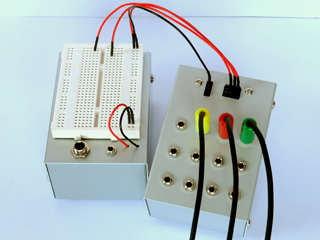 米本: ブレボなどで使用するジャンパーコードをミニジャックに変換するためのユニットです。 助手: これは意外と実用的ですね。 米本: うん! いろいろなコラボやイベント会場での経験から、Arduino(アルドゥイーノ)やブレボ上で組んだ回路などと、SYSTEM Yのユニットたちを素早く接続する必要性が出てきたんだ。それで試行錯誤しながら作りました。