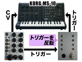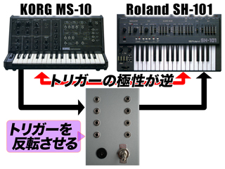 もう1つは、シンセをつなげるときのコンバーター。アナログシンセに詳しい方ならご存知だと思うけど、メーカーによってトリガーの極性が逆さまな場合があるのね。例えば私が愛用しているKORGのMS-10からROLANDのSH-101につなげた場合、SH-101が鳴りっぱなしになって、MS-10の鍵盤を押すとSH-101が鳴り止むって状態になってしまう。そこでこのMr.INVERTERを間に挟めば、ちゃんとMS-10の鍵盤を押したときにSH-101が一緒に鳴ってくれるようになる(注1)。