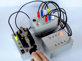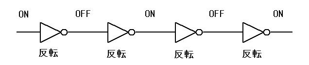 米本: このユニット、何とNOT回路が4つあるから、反転の反転の反転の反転が出来るよ! 助手: 反転の反転の反転の反転じゃ、元に戻るだけじゃないですか! 米本: いい所に気付いたね。試しに入力端子(1)に電鍵くんをつないで、出力端子(1)を入力端子(2)へ、出力端子(2)を入力端子(3)へ、出力端子(3)を入力端子(4)へ、出力端子(4)にLEDのユニットのダイ助をつなげてみた。