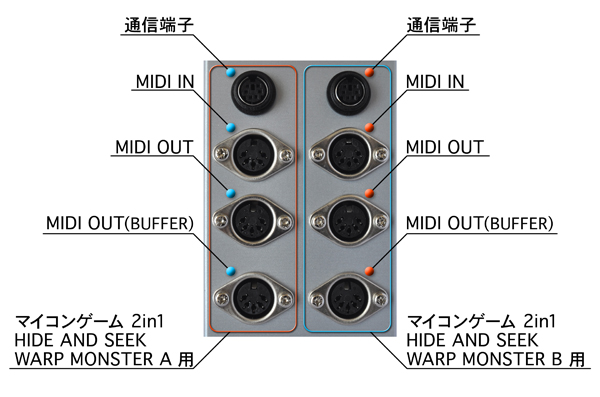 二見信洋さんとのコラボ。 マイコンゲーム 2in1 "HIDE AND SEEK ONLINE" / "WARP MONSTER" AとBのMIDI送受信を外部に出力するためのユニット。